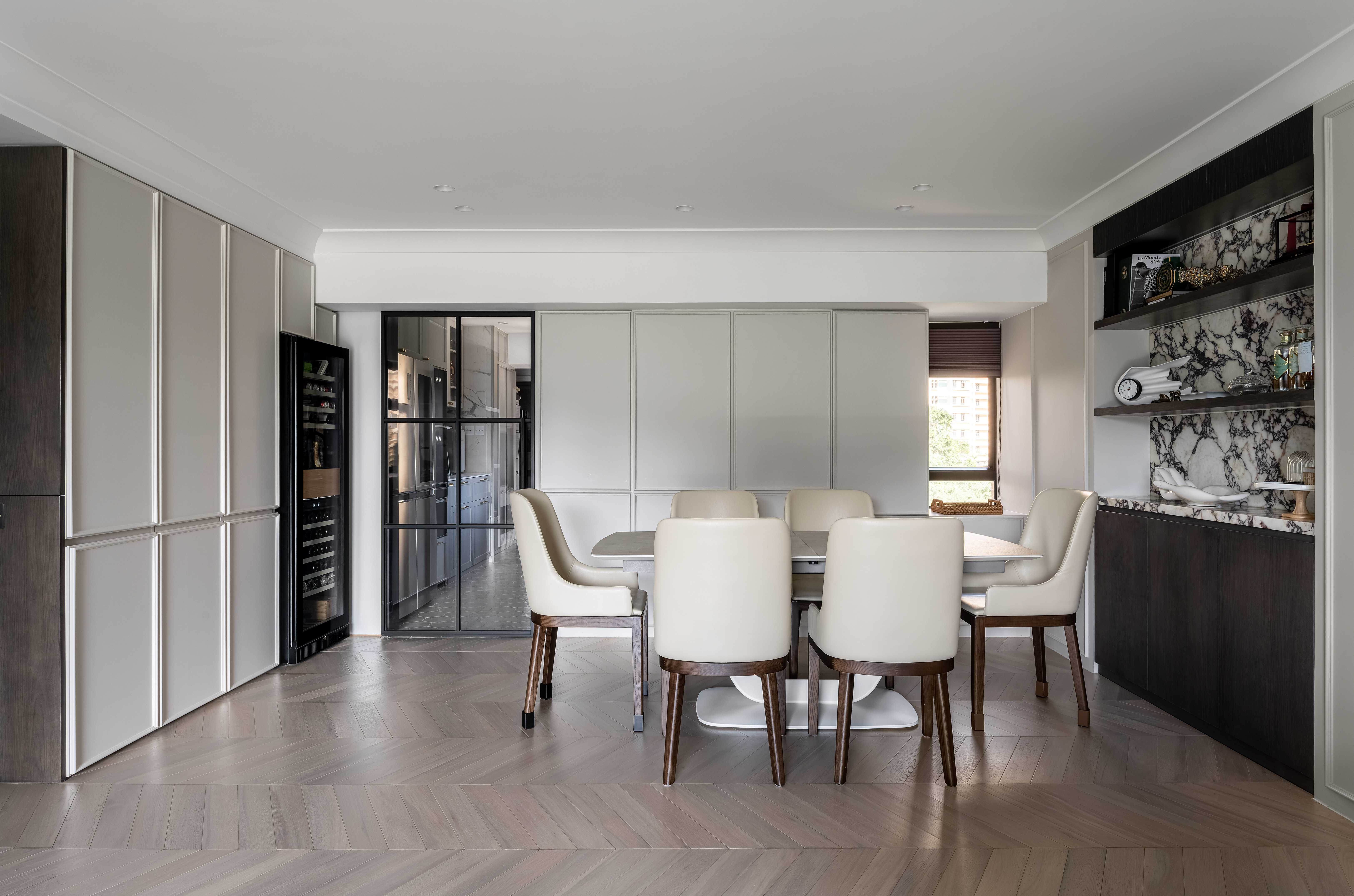 Decorative moldings has been an important design elements in classical design , by avoiding excessive decorative components, the design concept would be a perfect combination between contemporary and classical design . The transitional design in light creamy and wooden texture in this project, as how we describe it, has greatly enhanced the grand, elegance in a timeless manner. Functional flexibilities also own a priority in this modern dwelling, rather than cabinet, free spaces serve more options in lives.