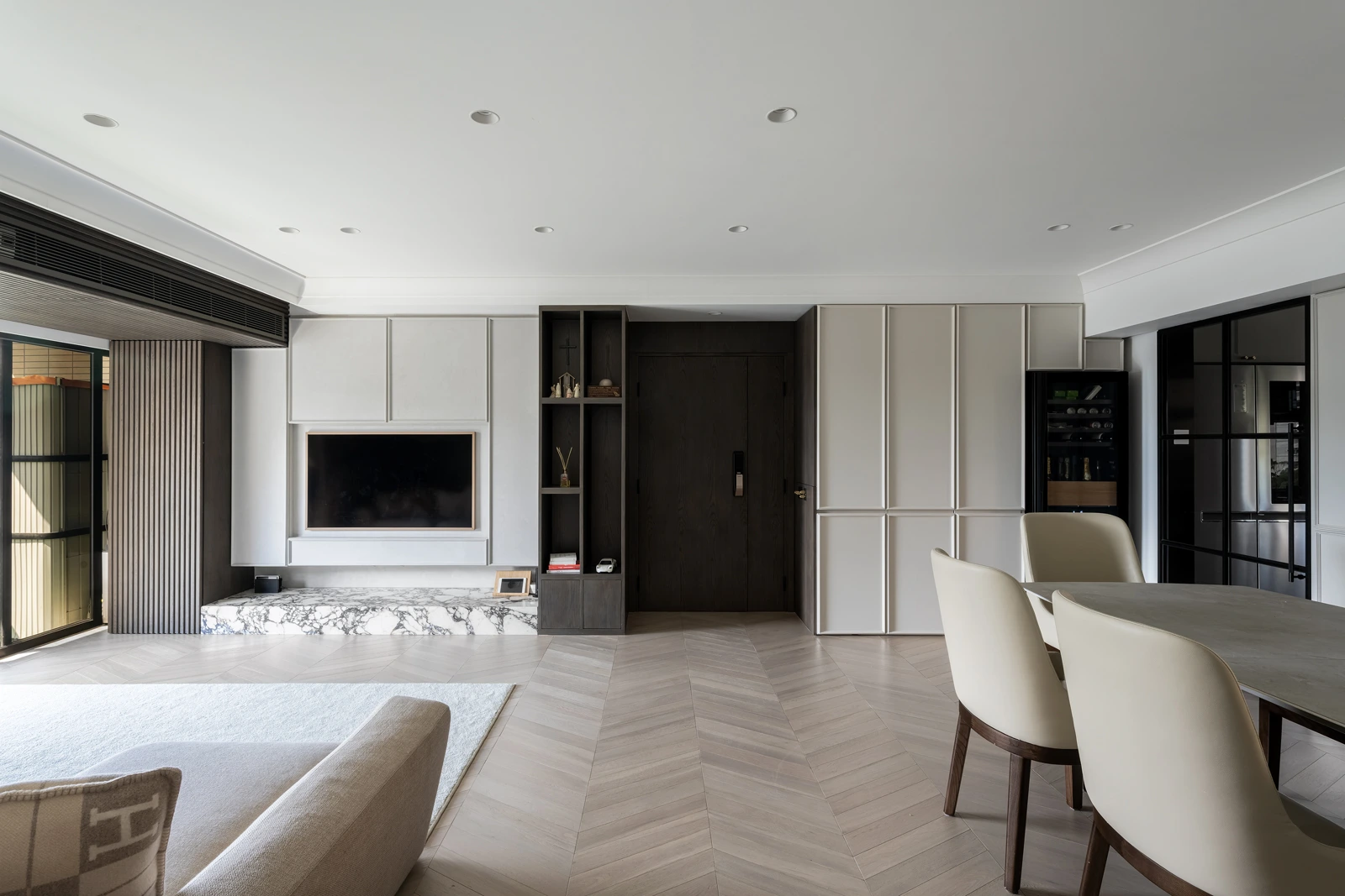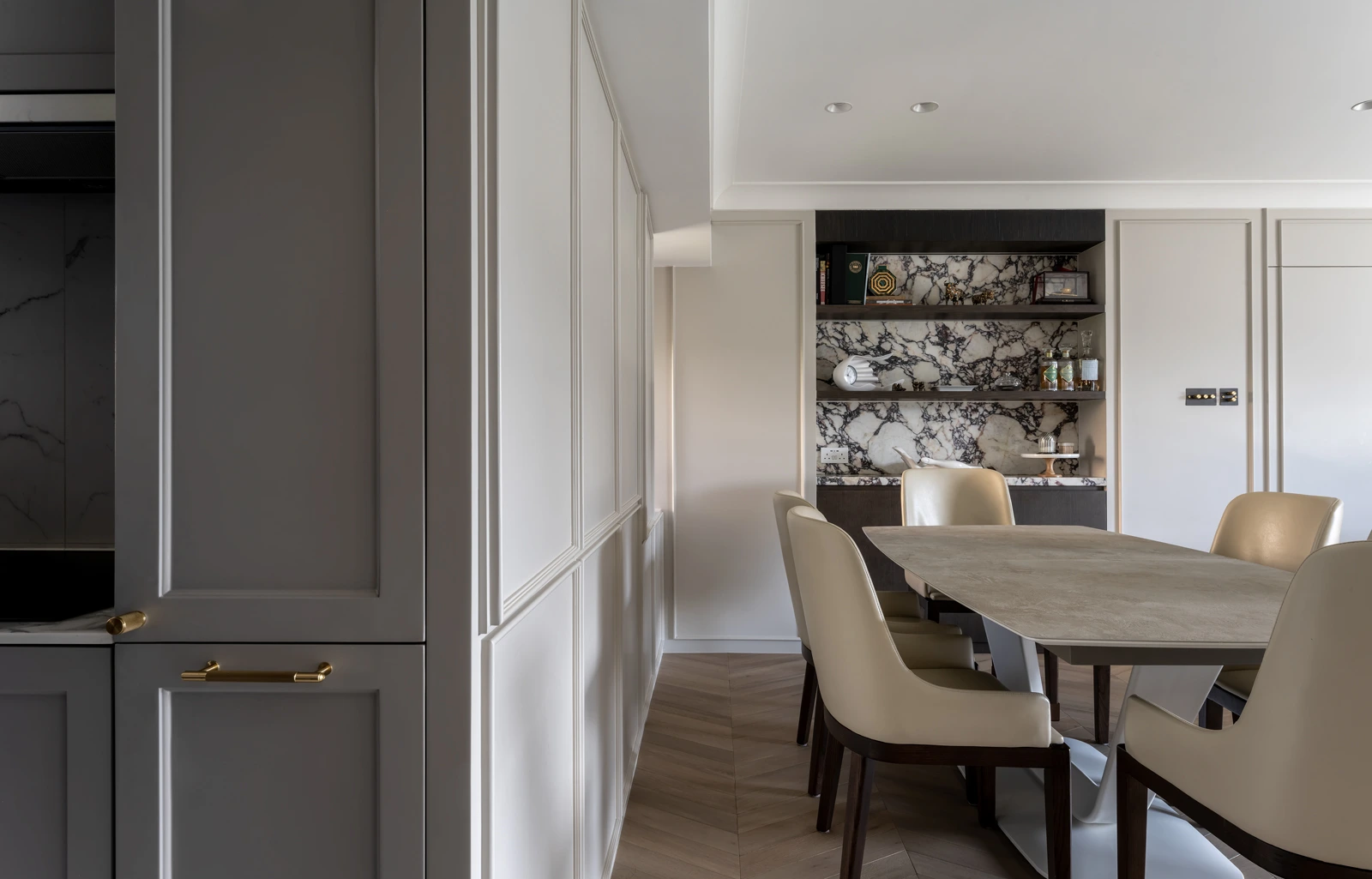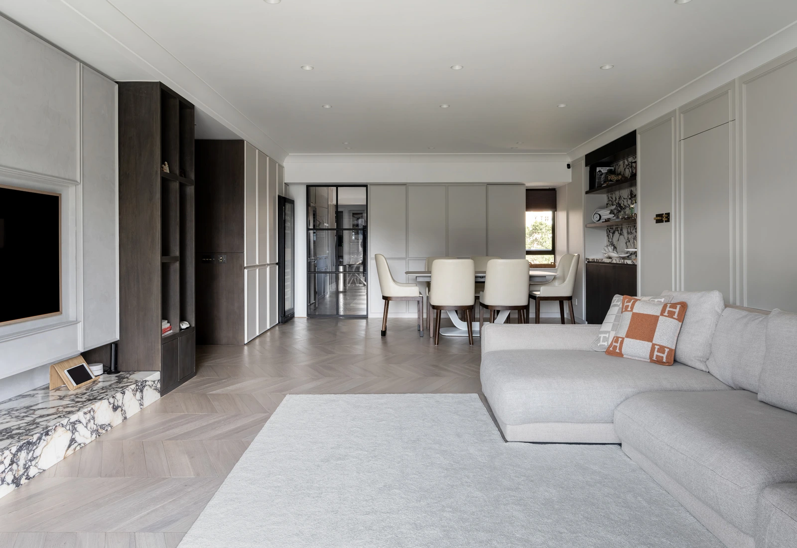 At Cavendish Height, we set out to translate the client’s desire for light, openness, and flexibility into a calm yet refined living environment. Abundant natural light defines the space, while a fluid layout avoids excessive built-ins, allowing the home to adapt naturally to everyday life. A palette of warm wood and soft cream tones is paired with delicately veined marble accents, creating a contemporary atmosphere that feels elegant, restrained, and quietly luxurious.