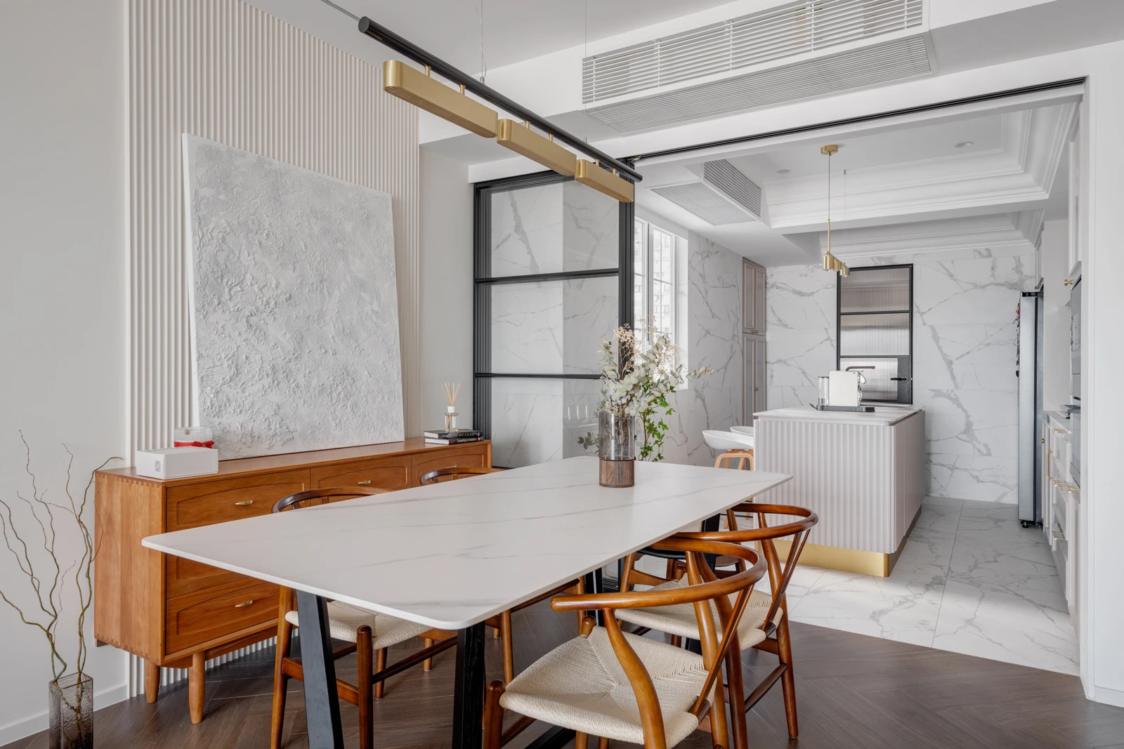 Inspired by medieval French design, the Coral Court residence is defined by natural materials, clean lines, and a restrained palette of layered beige tones. Varying wood finishes add depth and warmth, while subtle mouldings and linear details refine the architectural form. Curated artworks complete the interior, resulting in a balanced and timeless living space.