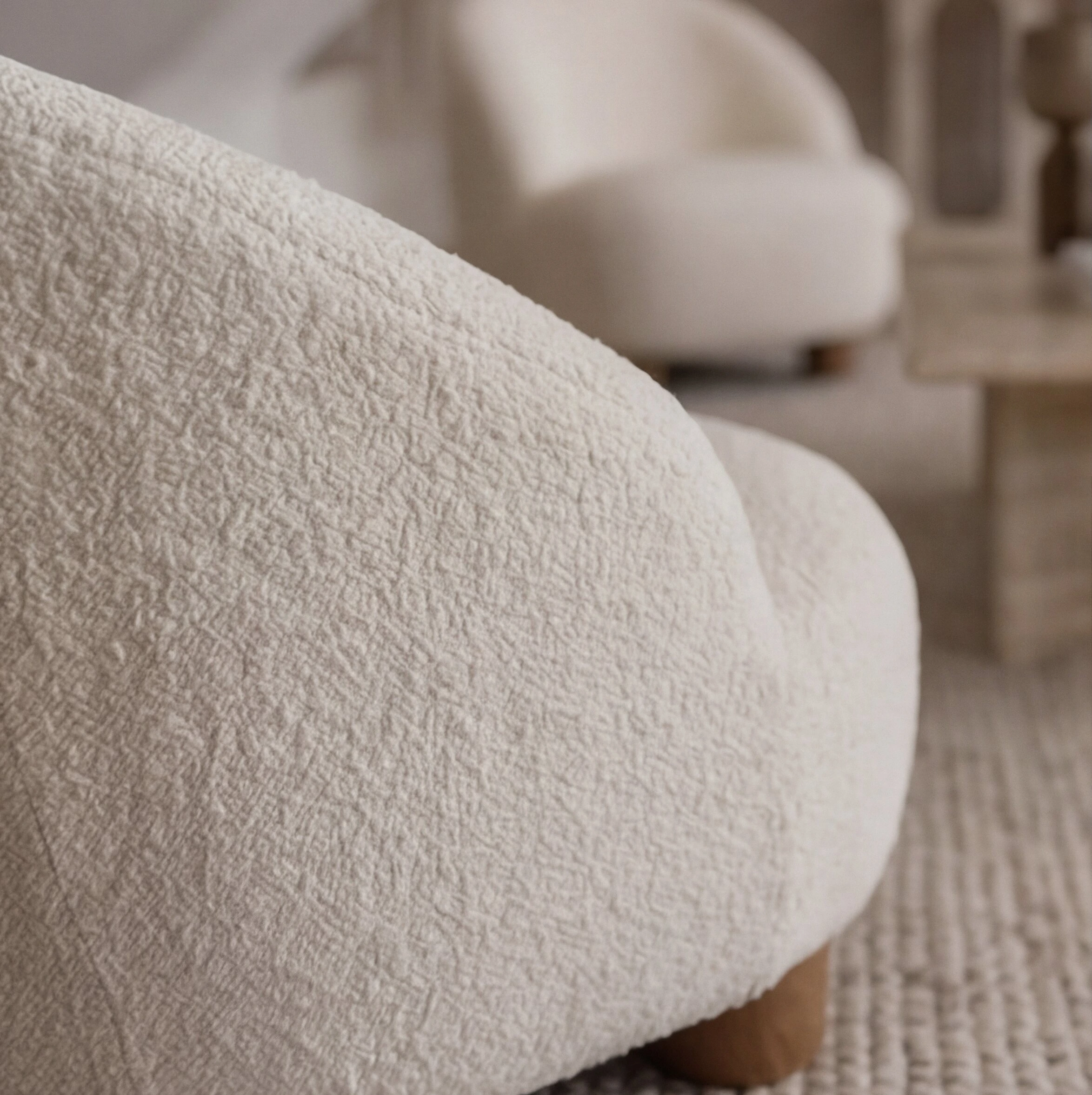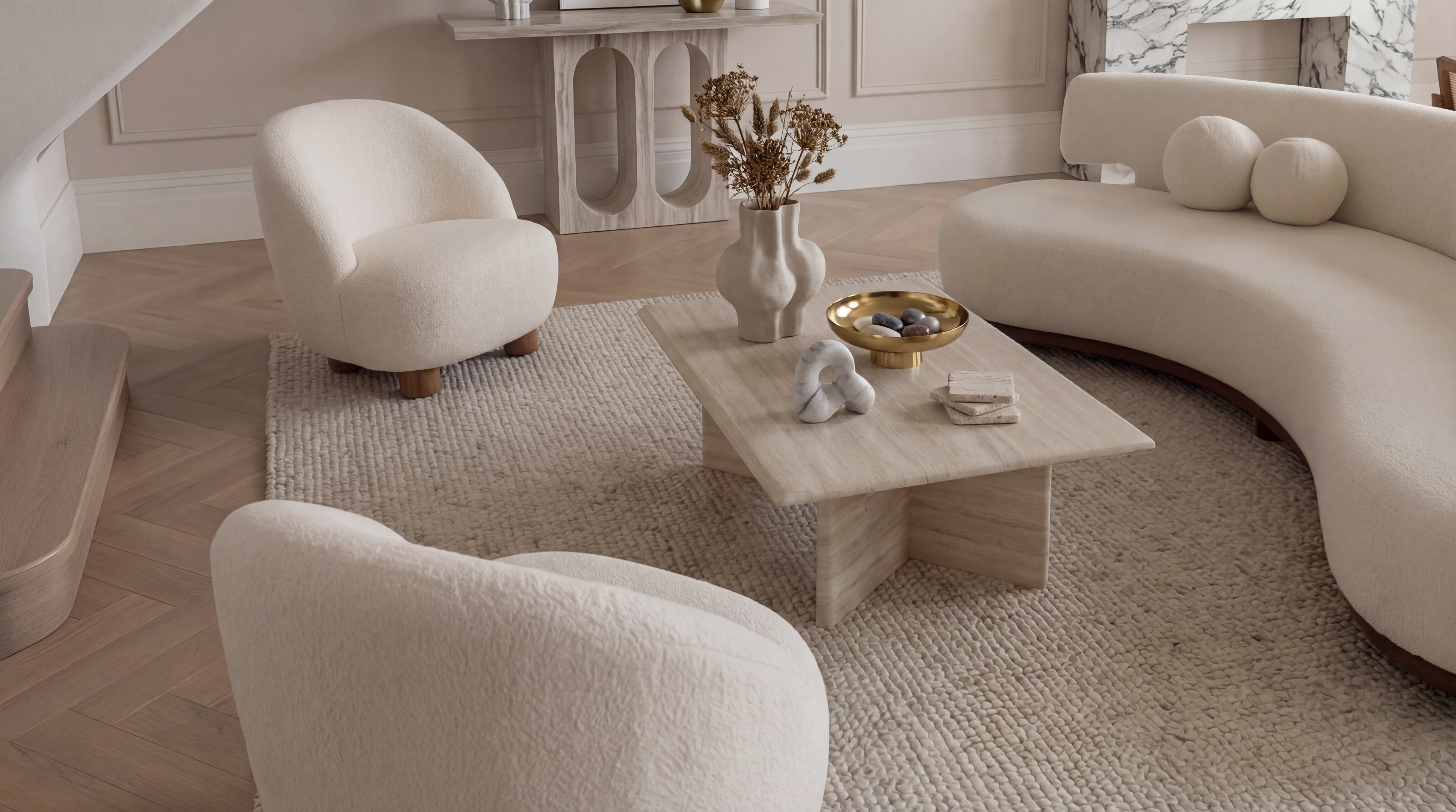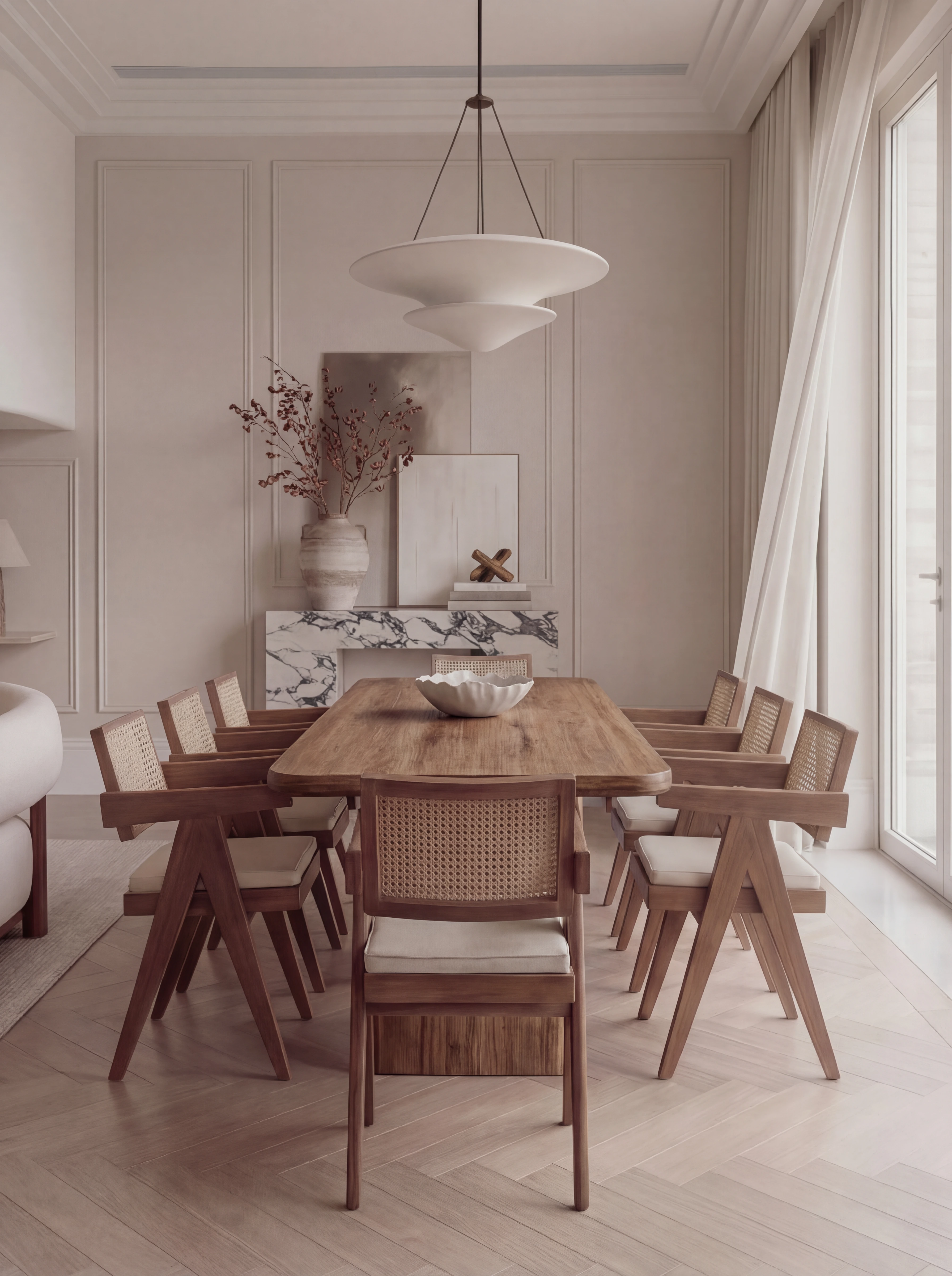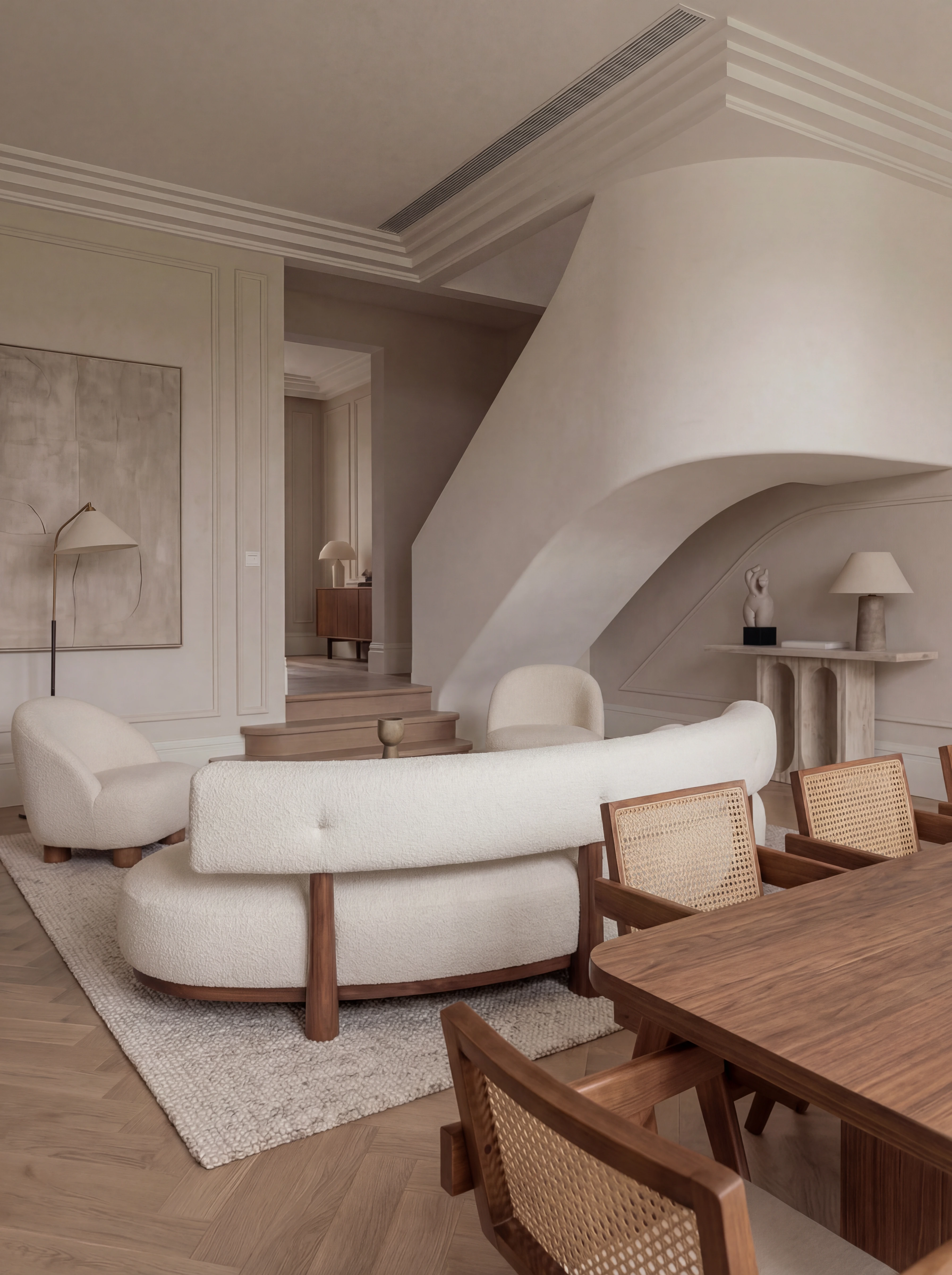 Le Cap, located at Kau To Shan, this detached house is conceived on a Contemporary European foundation, articulated through sculptural structure and layered materials to establish an elegant and luminous visual continuity. Soft mineral beige walls with classical mouldings diffuse natural daylight evenly, while light oak herringbone flooring runs seamlessly through the living and dining areas, reinforcing spatial order and proportion.